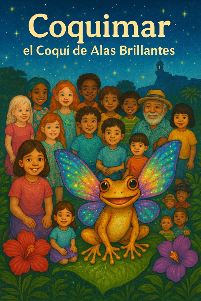 Durante un temblor suave, un pequeño frasco de brillo mágico cayó al suelo, y de él nació un coquí diferente: con alas luminosas, alma curiosa y un deseo profundo de encontrar su lugar en el mundo.